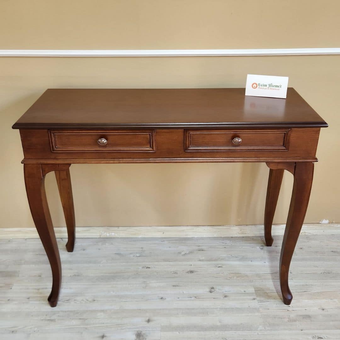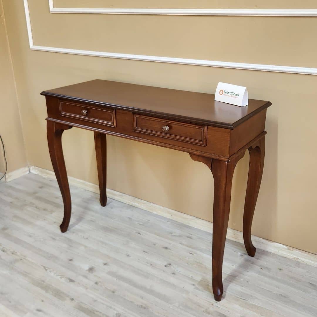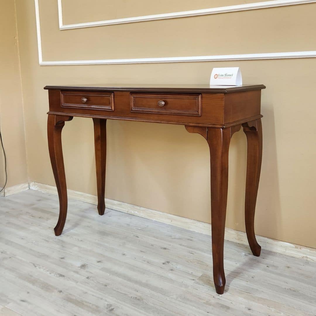 Doğal ceviz renk cilası, ahşabın karakteristik dokusunu ön plana çıkarırken; kavisli lükens ayaklar ve zarif çekmece detayları ürüne estetik bir görünüm kazandırır. Antre, salon, koridor ya da yatak odalarında dekoratif ve kullanışlı bir tamamlayıcı olarak tercih edilebilir.