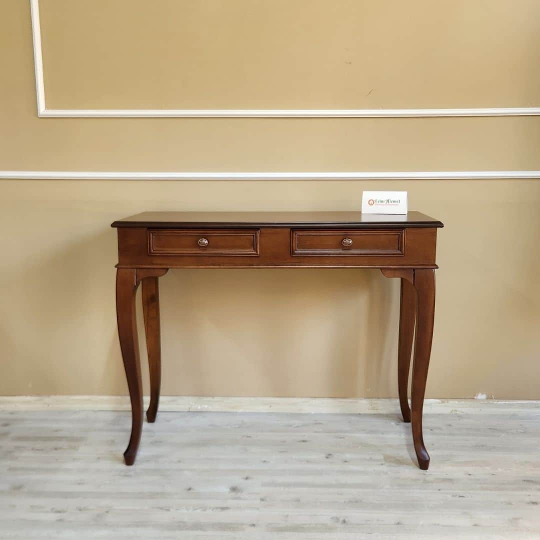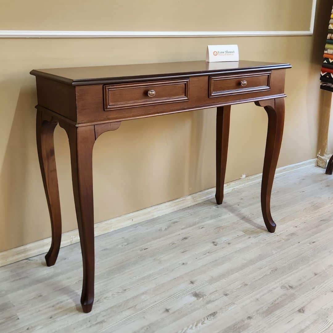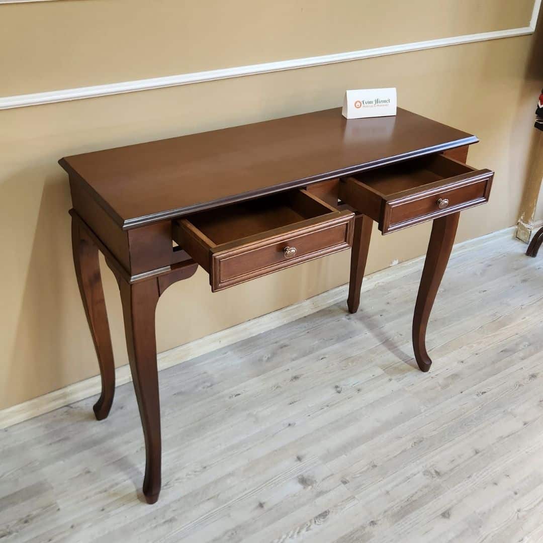 Doğal ceviz renk cilası, ahşabın karakteristik dokusunu ön plana çıkarırken; kavisli lükens ayaklar ve zarif çekmece detayları ürüne estetik bir görünüm kazandırır. Antre, salon, koridor ya da yatak odalarında dekoratif ve kullanışlı bir tamamlayıcı olarak tercih edilebilir.