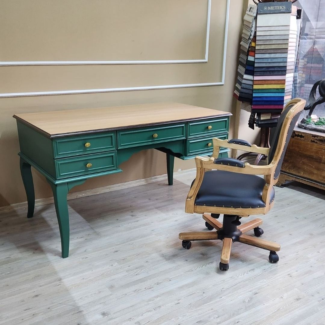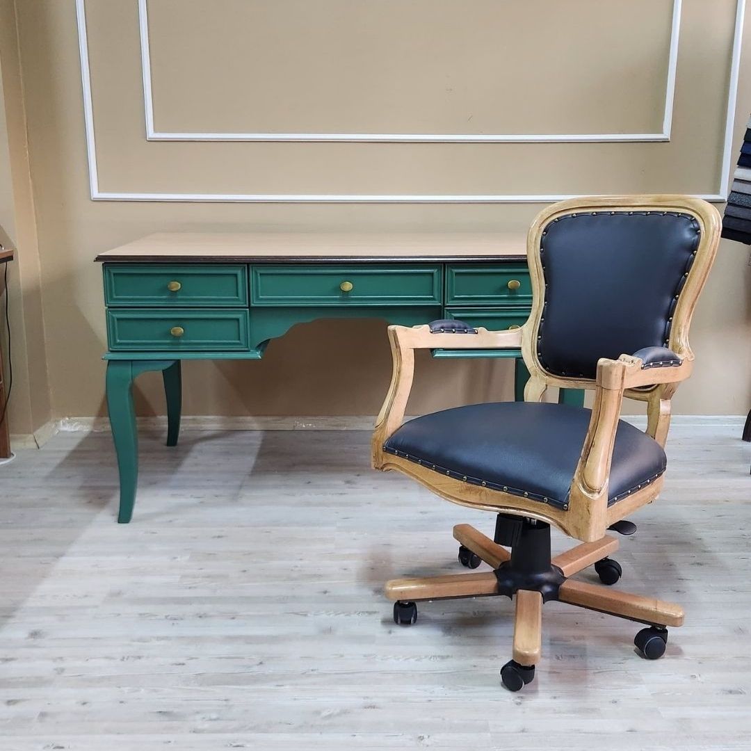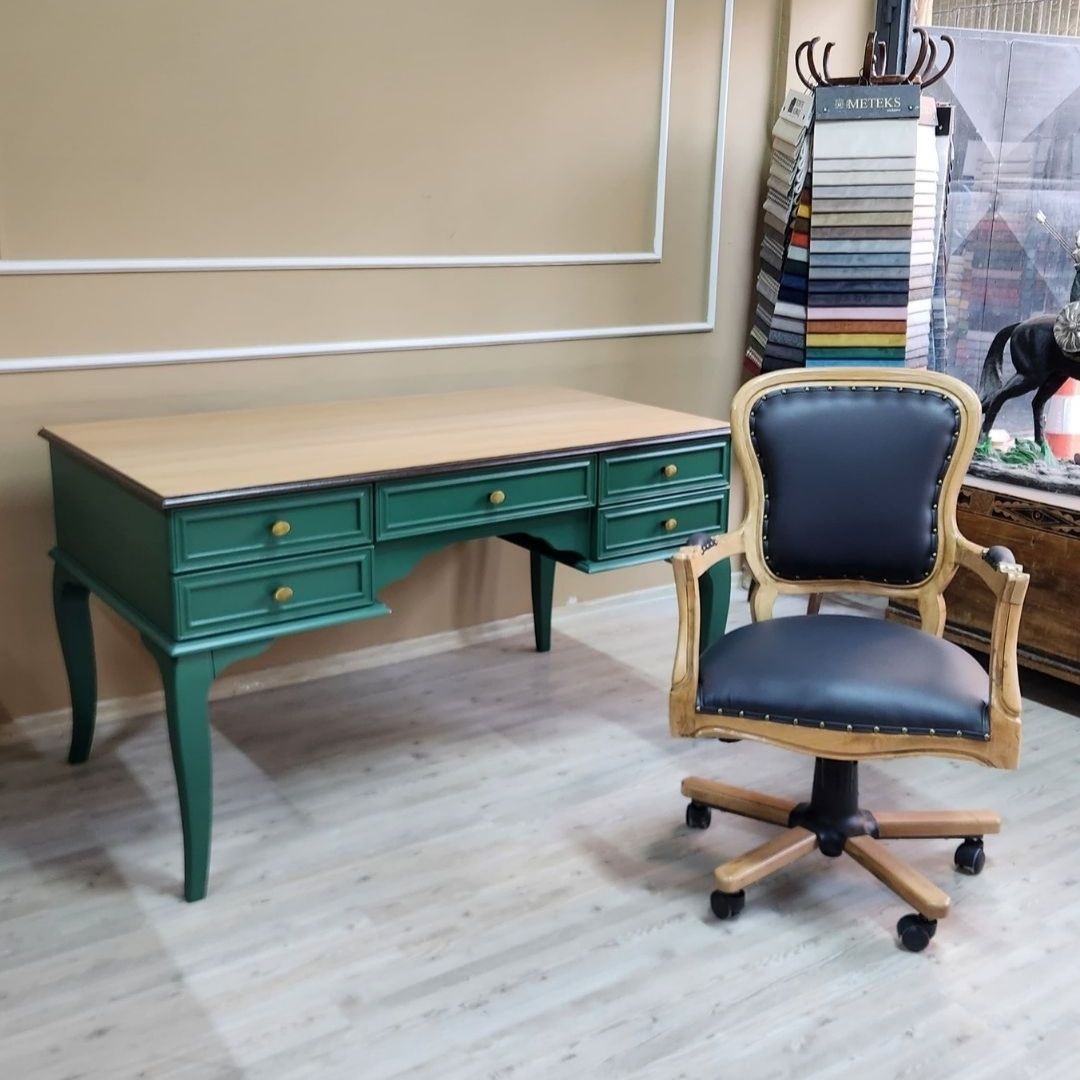 Evim Hizmet Natural Tablalı Kaktüs Yeşili Çizgi Çalışma Masası ve Döner Koltuk Takımı, estetik ve konforu bir araya getirerek çalışma alanlarınıza sıcak ve şık bir atmosfer kazandırır.