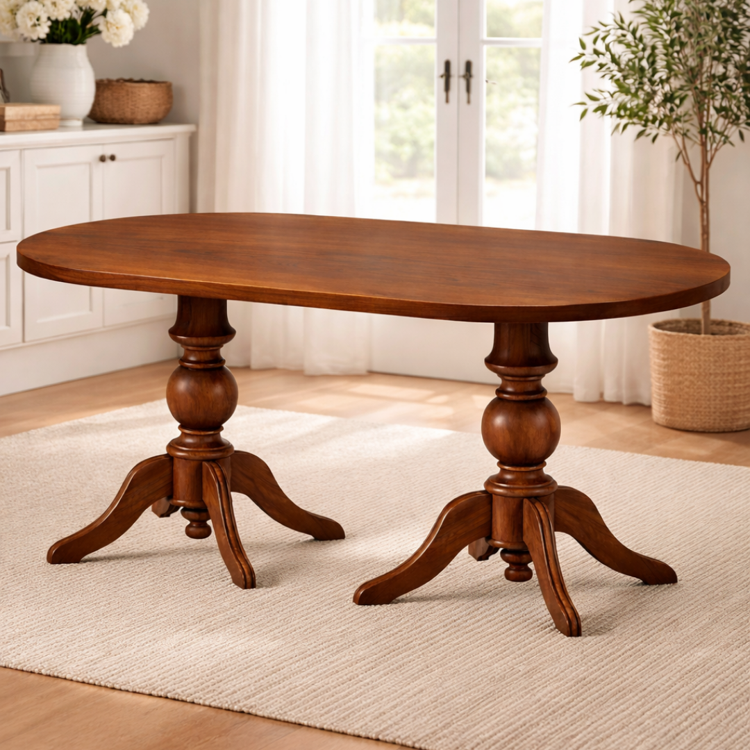 Doğal ahşabın sıcaklığını, klasik baba ayak formunun asaletiyle birleştiren Evim Hizmet Oval Baba Ayak Masa, hem günlük kullanıma hem de özel davetlere uyum sağlayan şık bir merkez parçasıdır.